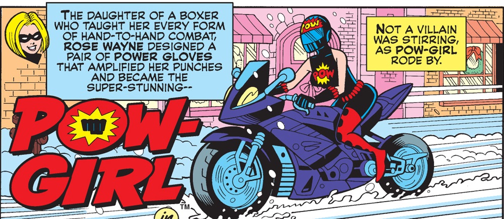 The Archie superheroes are somewhat notorious for their confusing continuity. Originally, Pow-Girl was Rose Wayne Raymond, or “Rosie,” a student of Professor John Raymond’s Criminology class. After she and John were assaulted by some Japanese spies, Rose noticed a spider clasp that was dropped by the professor and concluded he must be the Web. Being that she was studying Criminology, she began to follow John, and became enamored with him because he was the Web. Soon they were dating, and John confessed about his dual identity. They finally married, and at first she enjoyed the glamorous life of being “Mrs. Web.” However, over time she became a fussy and emotionally manipulative wife. She often would threaten John with divorce and even infidelity. Always running to mother, but never divorcing John, she continued her hen-pecking and poor John carried on being her spineless spouse while sneaking out to be the heroic Web. She created the Pow-Girl identity to spend more time with her husband, rather than any true desire to be a hero.