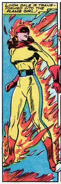 Linda Dale worked for Gary Preston also known as the Flame. It was her work with Gary that put her in many heroic situations. She later decided to become his sidekick, donning a costume that was very similar to the Flame’s. At first Gary was against her becoming the Flame Girl but, slowly, the Flame taught Flame Girl the secrets of fire control. After learning everything she could from the Flame, Flame Girl received her own hand held flame thrower. The two of them were a potent partnership and she had almost the same powers as Gary, though she was less of a brawler and more acrobatic.
