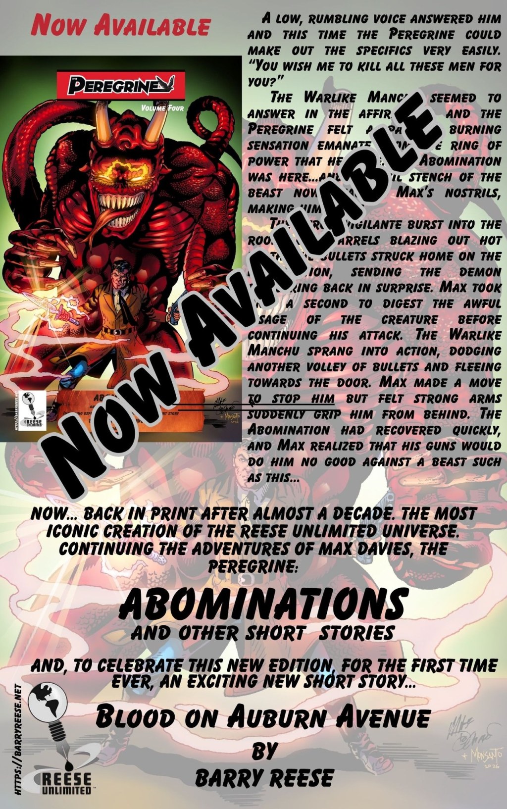 REESE UNLIMITED is happy to announce the 4th book in the re-released series of THE PEREGRINE – Author Barry Reese ‘s iconic hero. 5 stories from the beginnings of the Peregrine including a cool crossover with THE DOMINO LADY and a new, just for this edition, 6th story BLOOD ON AUBURN AVENUE.